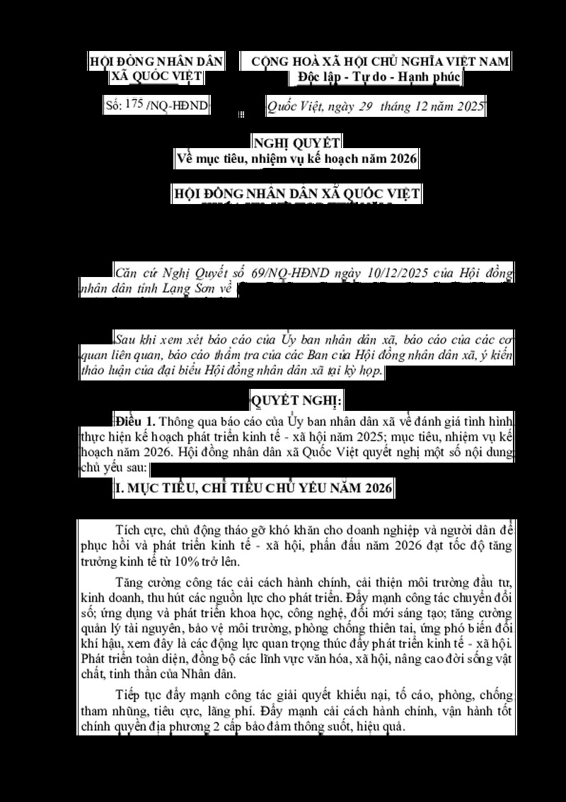 | Tiêu đề văn bản | Nghị quyết về mục tiêu, nhiệm vụ kế hoạch năm 2026 | ||