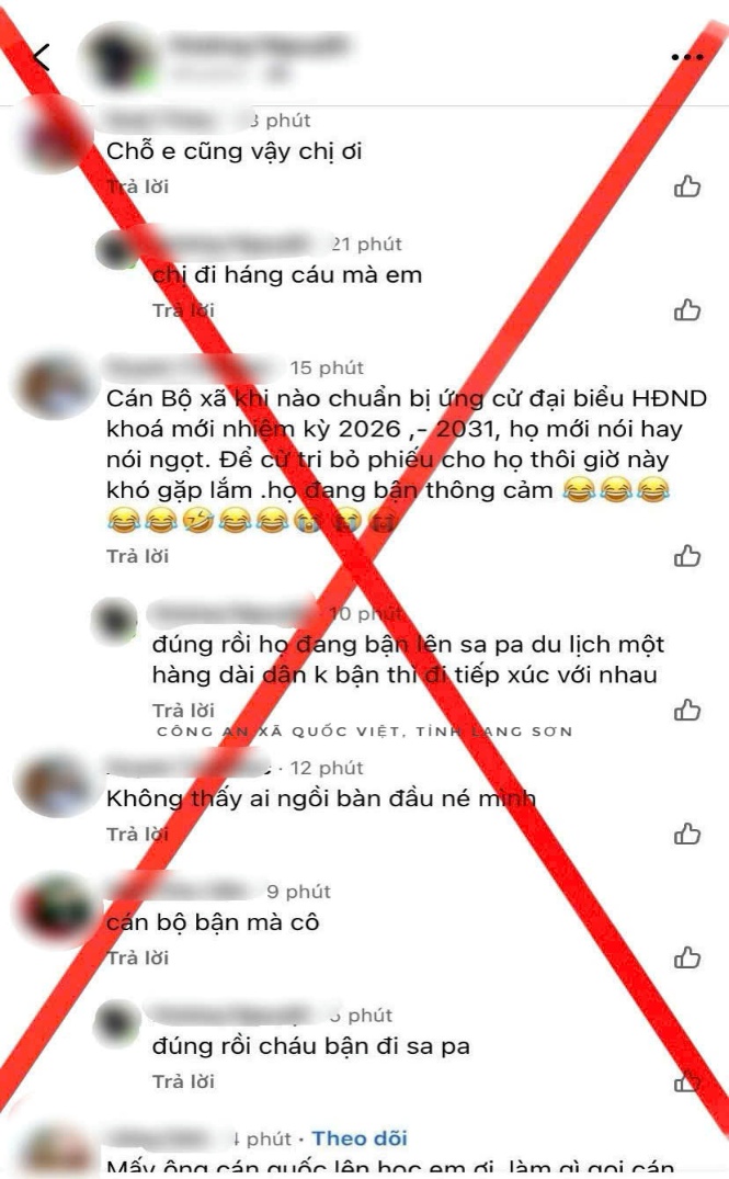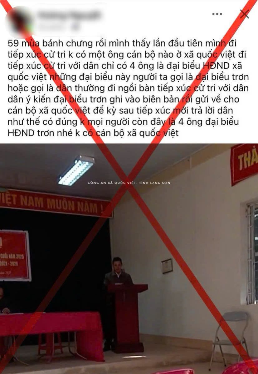 Ngày 04/12/2025, qua nắm tình hình trên không gian mạng, Công an xã Quốc Việt, tỉnh Lạng Sơn phát hiện và tiến hành gọi hỏi, răn đe với trường hợp H.T.N, trú thôn Cốc Muống, xã Quốc Việt, tỉnh Lạng Sơn về hành vi đăng tải thông tin không phù hợp trên mạng xã hội Facebook liên quan đến hoạt động tiếp xúc cử tri của đại biểu Hội đồng nhân dân xã.