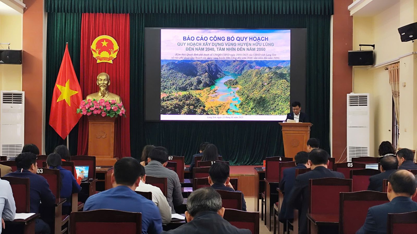 Tại hội nghị, Đại diện phòng Kinh tế - Hạ tầng huyện đã công bố Quyết định số 120/QĐ-UBND ngày 10/01/2025 của UBND tỉnh Lạng Sơn về việc phê duyệt Quy hoạch xây dựng vùng huyện Hữu Lũng đến năm 2040, tầm nhìn đến năm 2050. Đại diện Công ty Cổ phần tư vấn xây dựng và Quy hoạch đô thị đã trình bày đồ án quy hoạch.