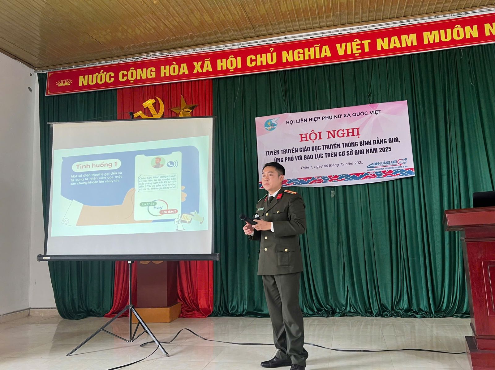 Trong 02 ngày cuối tuần 06,07/12/2025, Công an xã Quốc Việt phối hợp tuyên truyền phòng chống lừa đảo chiếm đoạt tài sản trên không gian mạng tại Hội nghị tuyên truyền, giáo dục, truyền thông bình đẳng giới, ứng phó với bạo lực trên cơ sở giới năm 2025 tại 04 thôn 1,2,3,4 do Hội Liên hiệp Phụ nữ xã tổ chức.