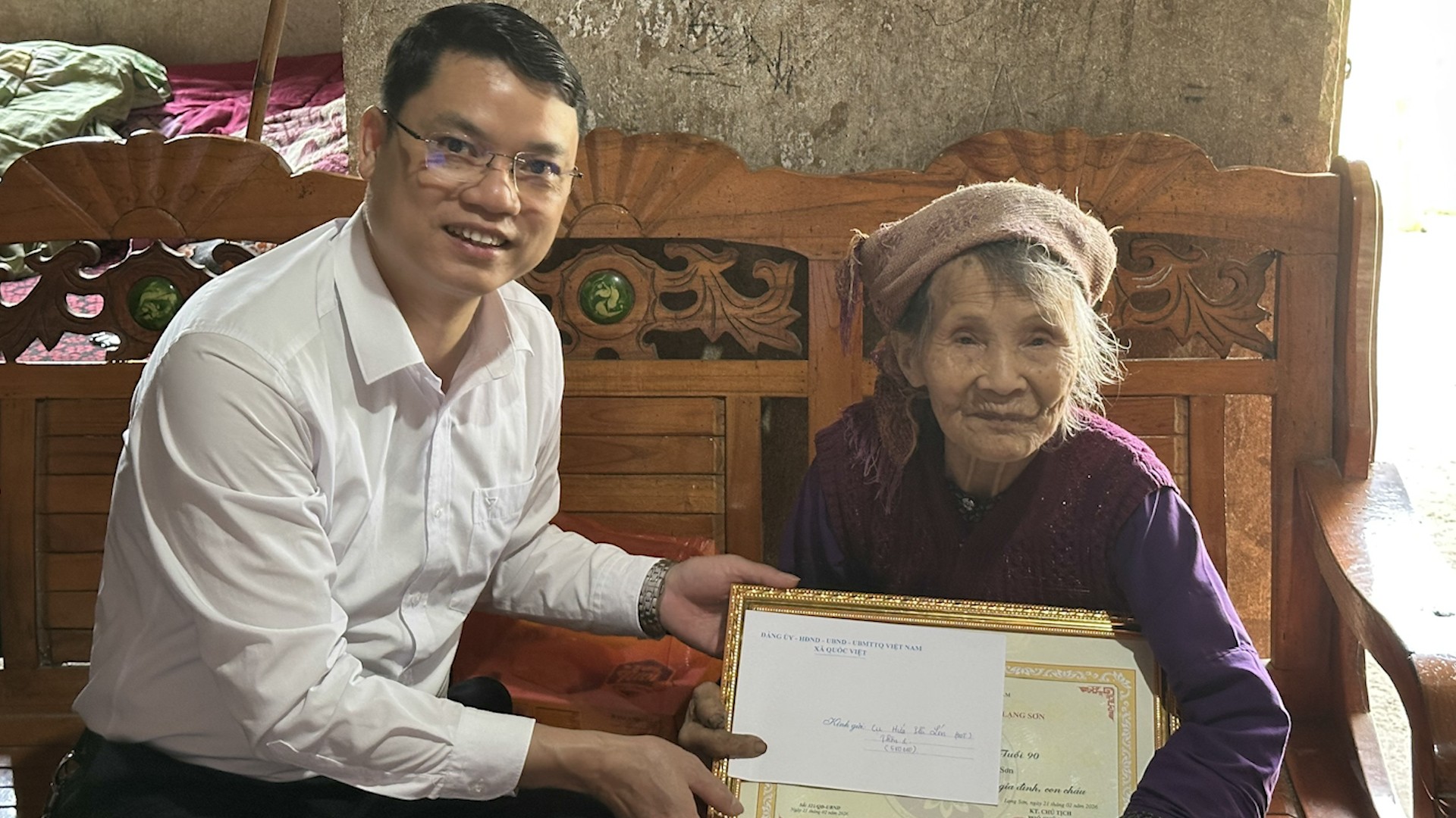 Đồng chí Đinh Khắc Hiển, Phó Bí thư Thường trực Đảng ủy xã tặng quà, chúc thọ cụ Chu Thị Cưu, thôn Nà Pò