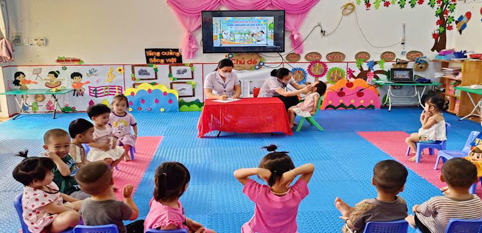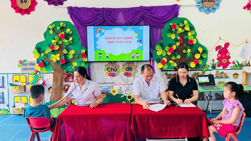 Cán bộ Y tế xã thăm khám tại trường Mầm non xã Quốc Việt