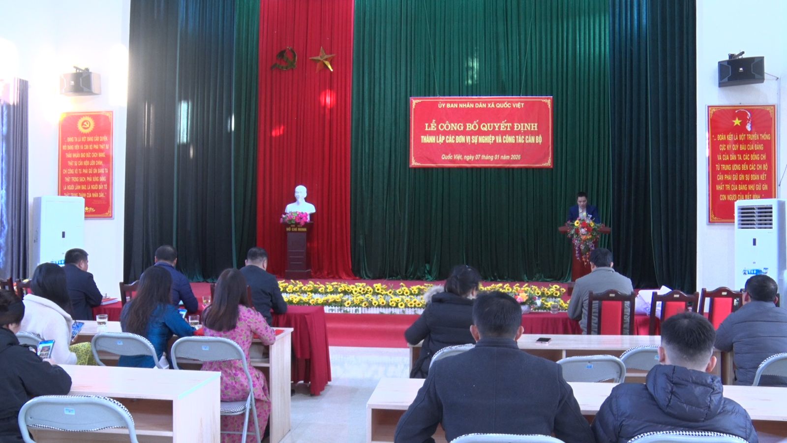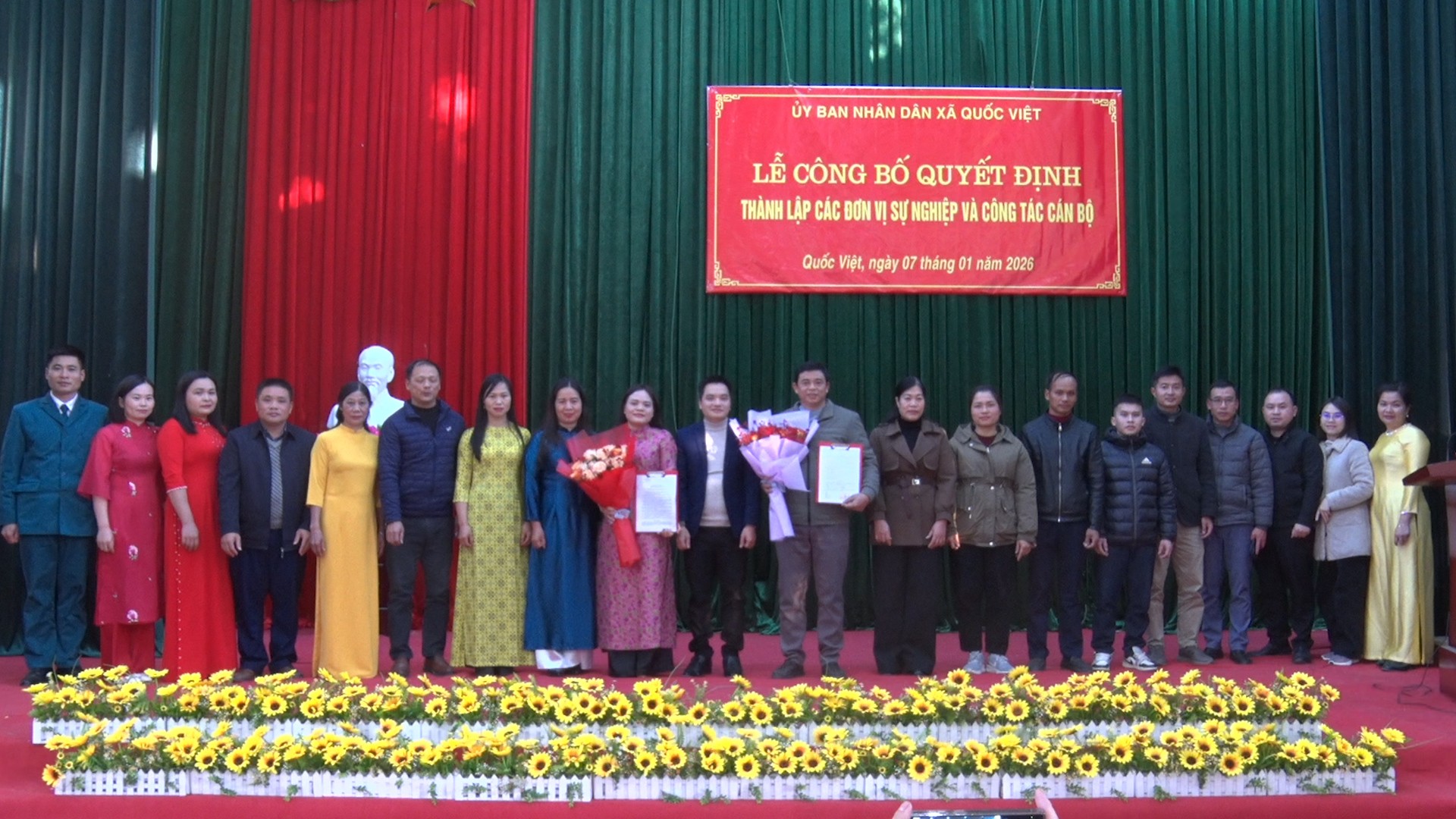 Chiều ngày 07/01/2026, tại hội trường Nhà văn hóa xã, UBND xã Quốc Việt tổ chức Lễ công bố các quyết định thành lập đơn vị sự nghiệp công và công tác cán bộ. Dự và chủ trì buổi lễ có đồng chí Nông Anh Đức, Phó Bí thư Đảng ủy, Chủ tịch UBND xã; các đồng chí lãnh đạo Đảng ủy, HĐND, UBND; các phòng chuyên môn của xã.