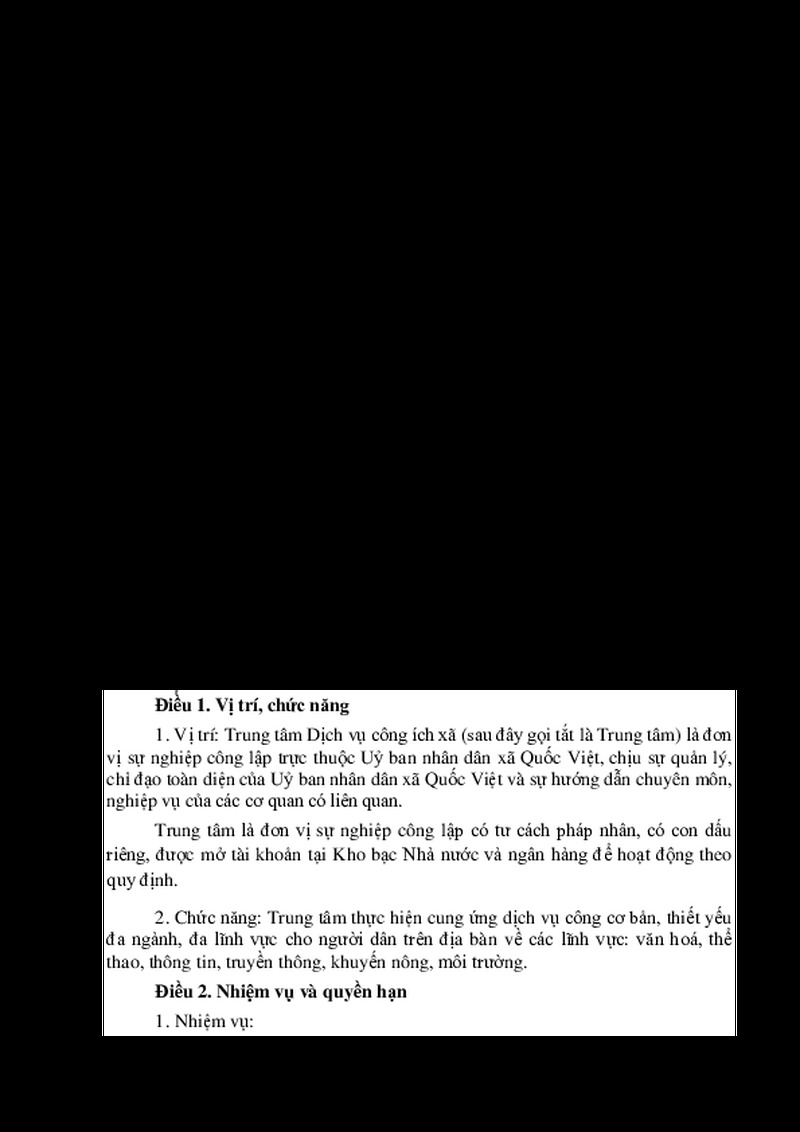 | Tiêu đề văn bản | QUYẾT ĐỊNH Quy định chức năng, nhiệm vụ, quyền hạn và cơ cấu tổ chức của Trung tâm Dịch vụ công ích xã Quốc Việt | ||