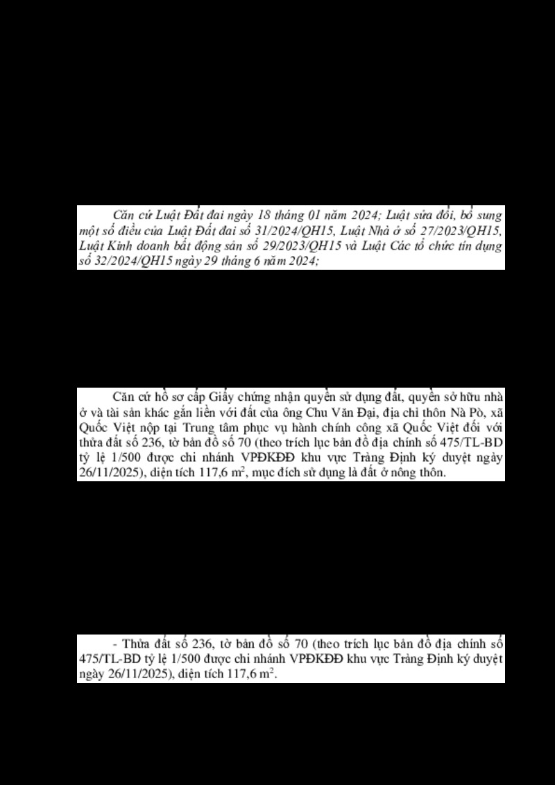 | Tiêu đề văn bản | Thông báo Niêm yết công khai hồ sơ đề nghị cấp Giấy chứng nhận quyền sử dụng đất, quyền sở hữu nhà ở và tài sản khác gắn liền với đất của ông Chu Văn Đại, thôn Nà Pò, xã Quốc Việt, tỉnh Lạng Sơn | ||