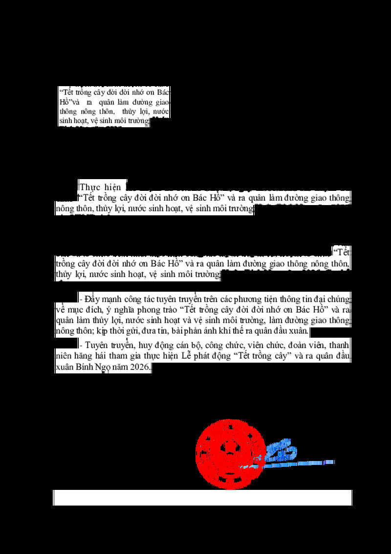 | Tiêu đề văn bản | V/v tuyên truyền kế hoạch Tổ chức “Tết trồng cây đời đời nhớ ơn Bác Hồ”và ra quân làm đường giao thông nông thôn, thủy lợi, nước sinh hoạt, vệ sinh môi trường Xuân Bính Ngọ năm 2026 | ||
